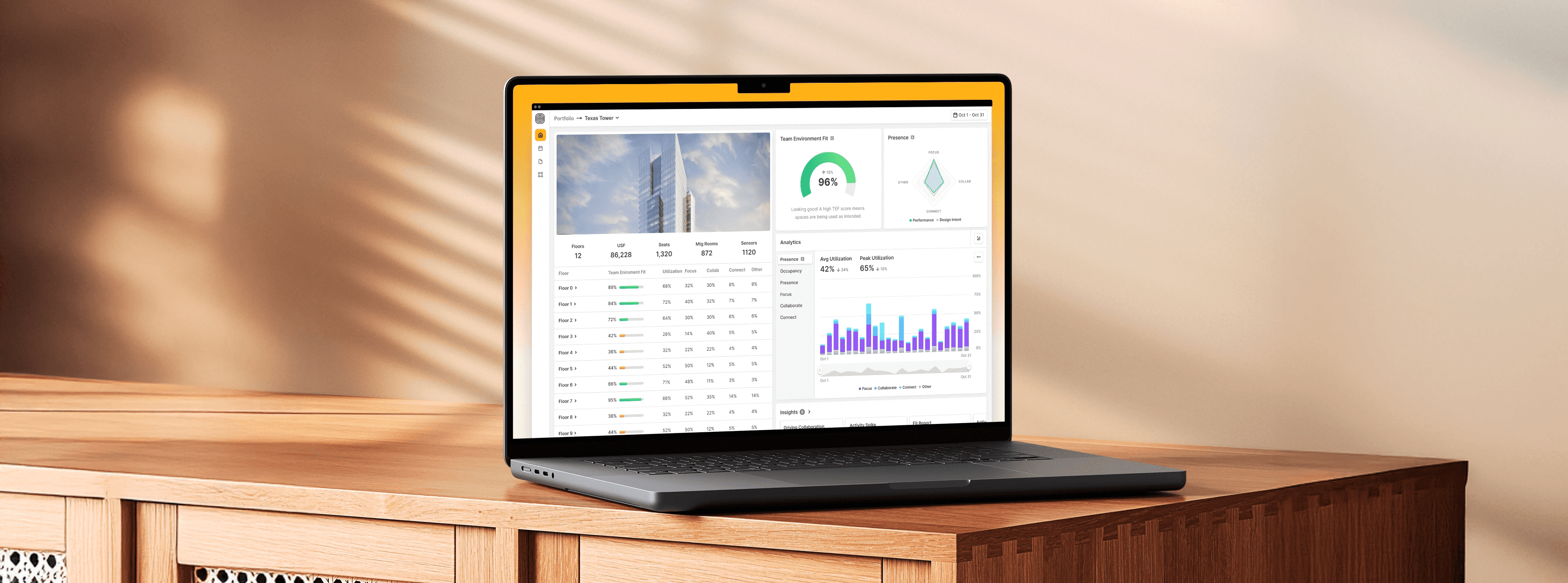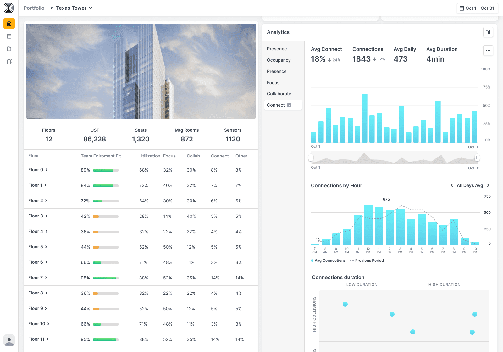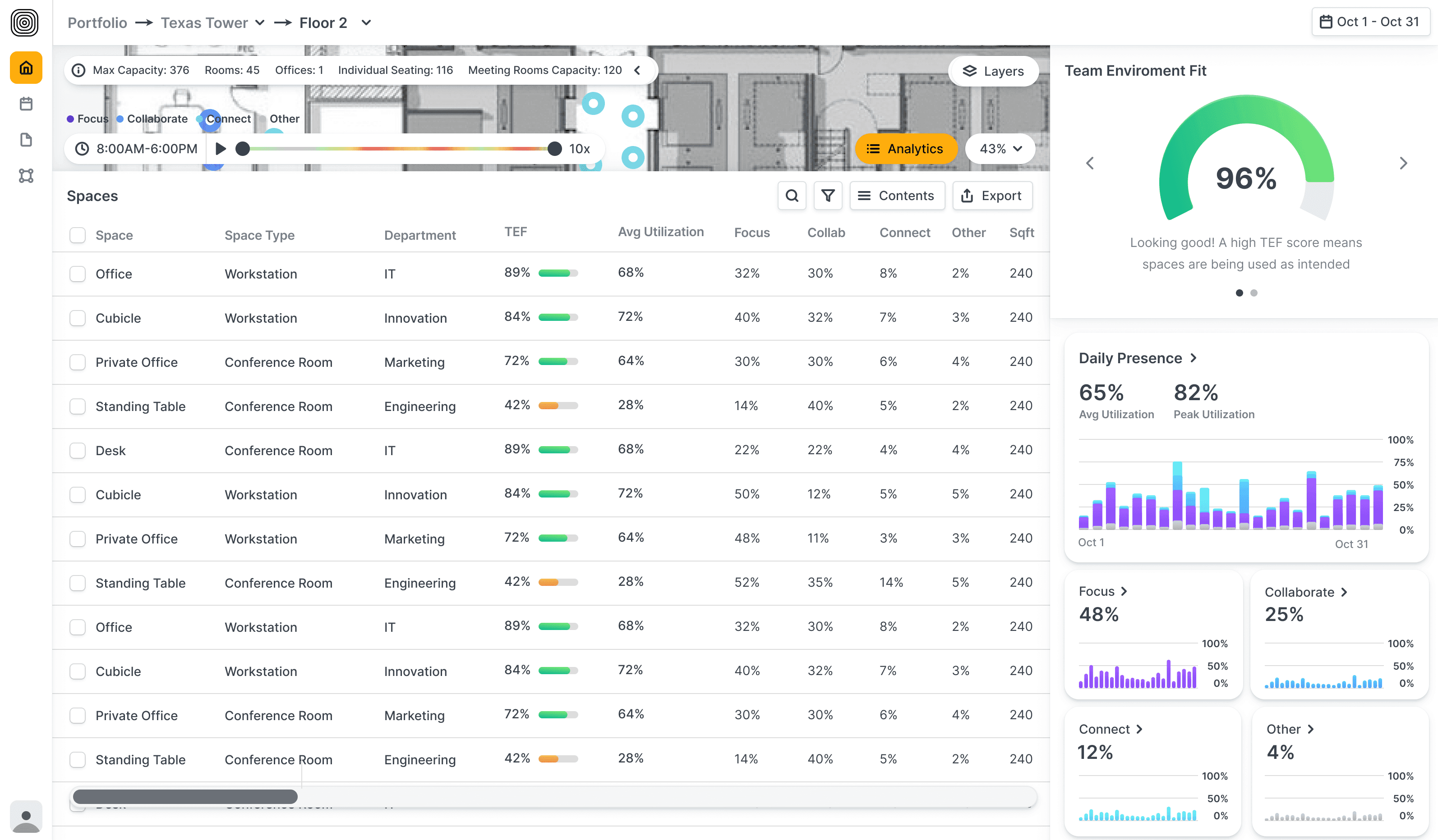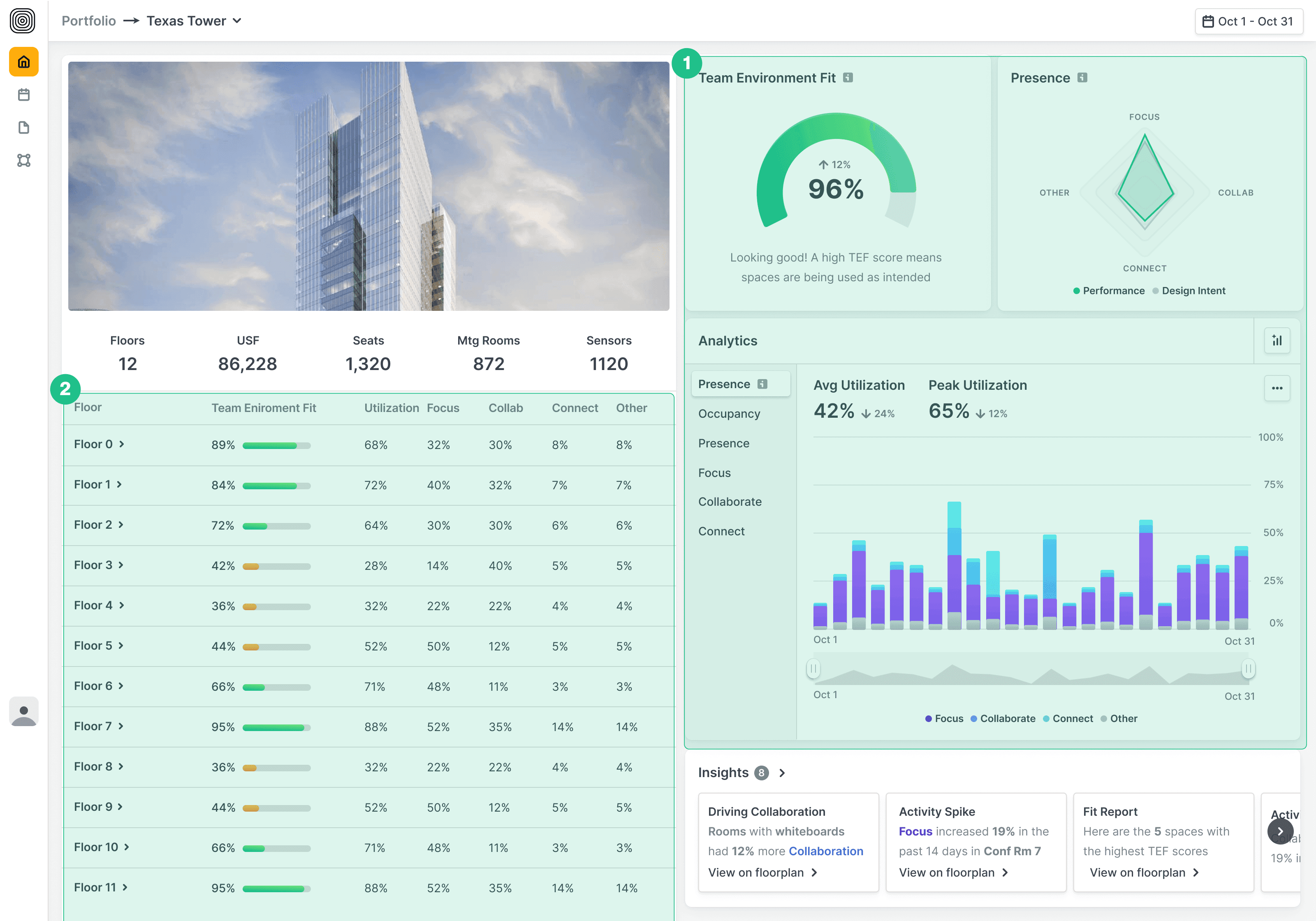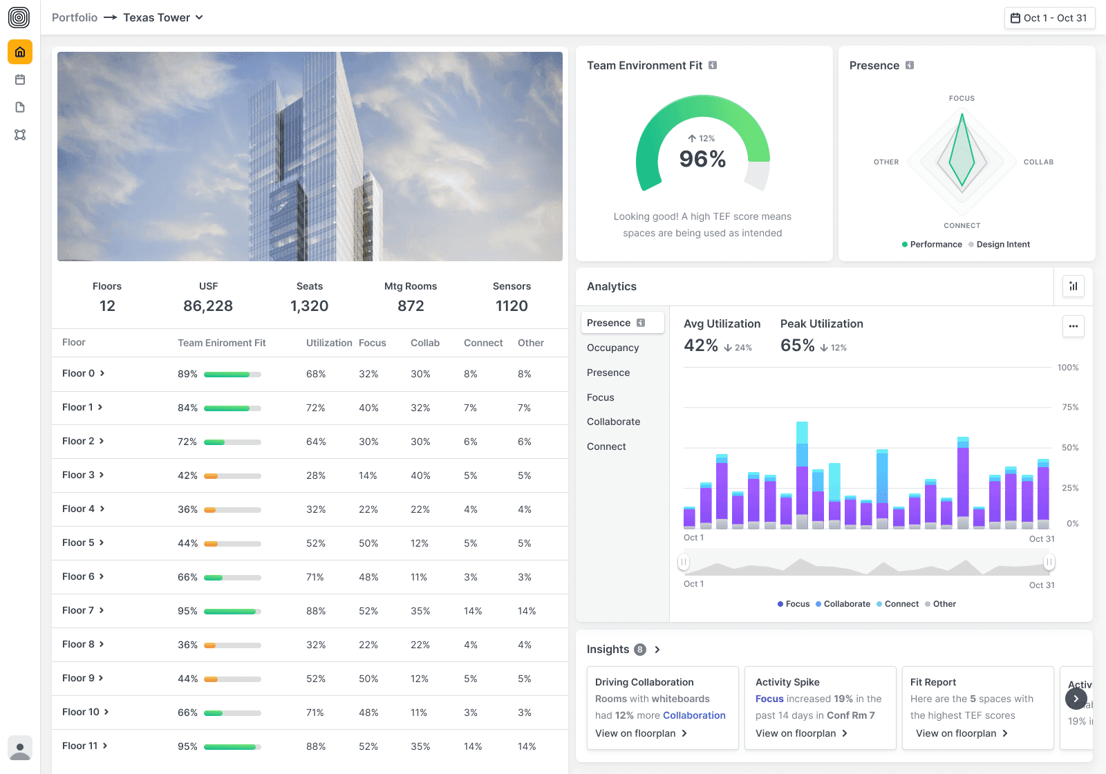 We reimagined this page to stop the guesswork—bringing clarity to how buildings are performing across a portfolio. With quick access to team fit scores, presence insights, and analytics, leaders can spot underperforming spaces and take action faster.