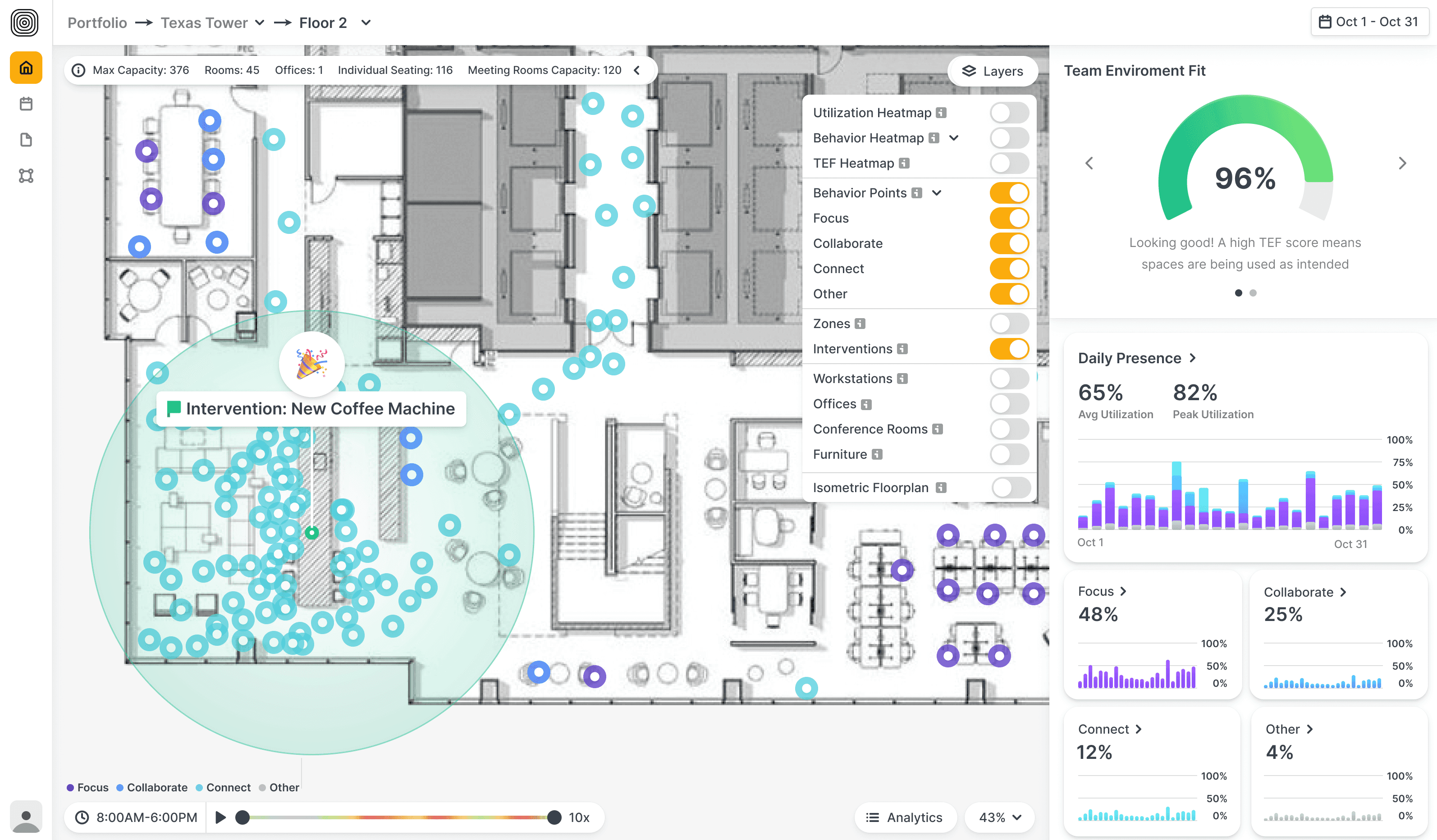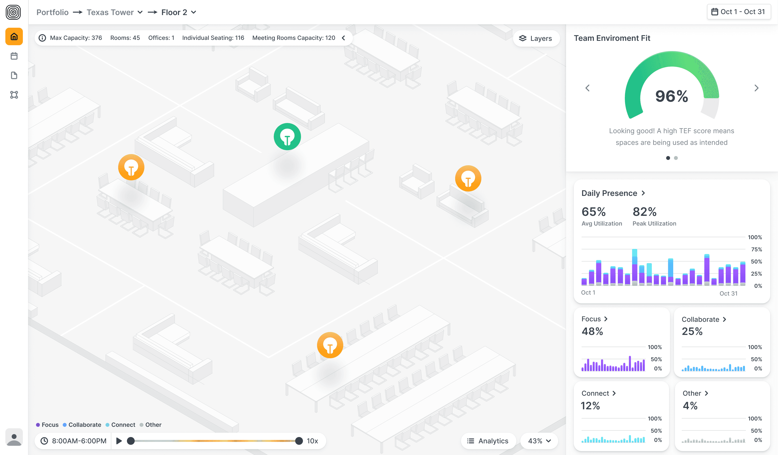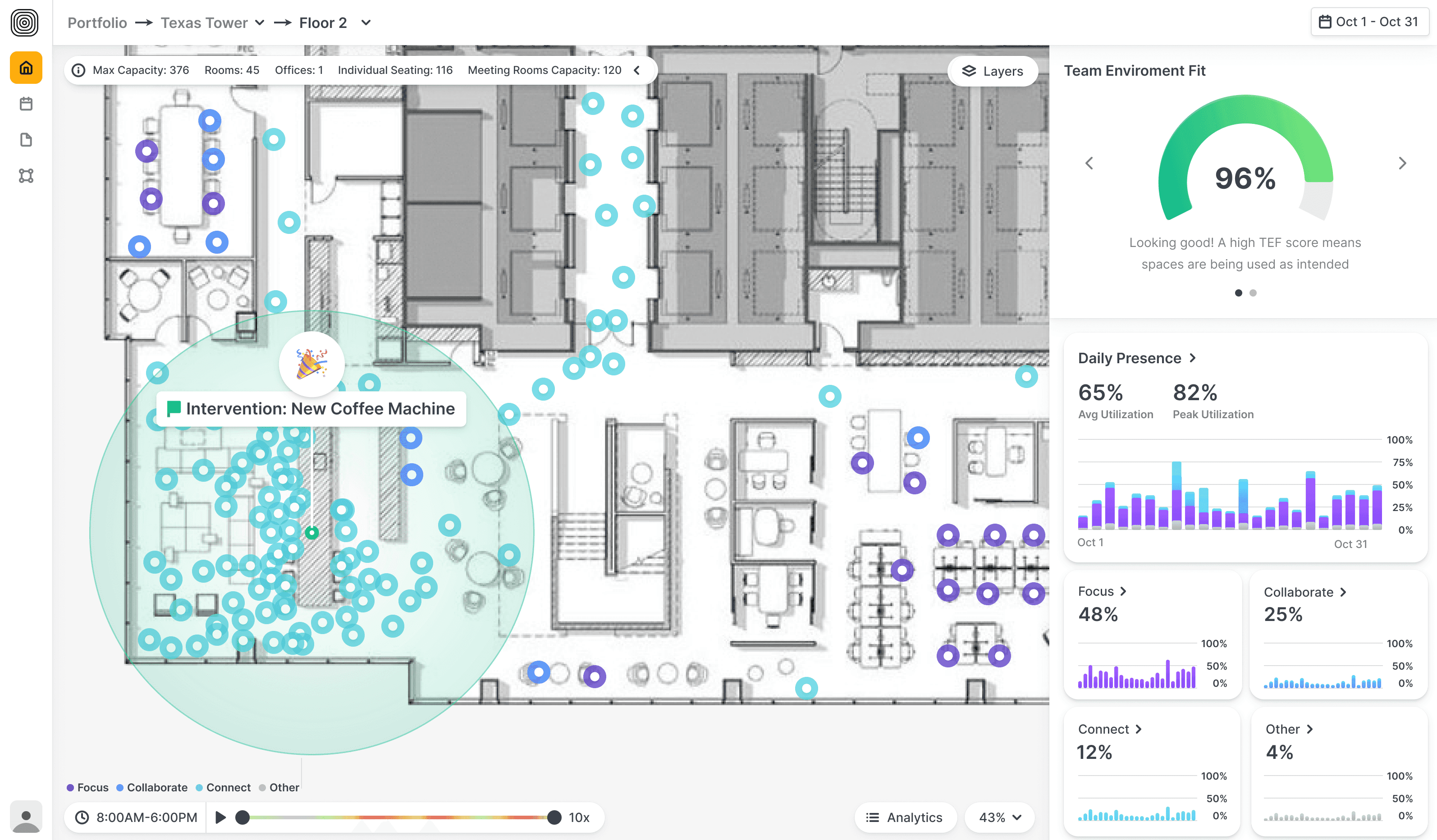AI-powered software transformed sensor data into human-readable insights. Working with our co-founder and workplace strategist, Pete Bacevice, I helped develop the Focus / Collaborate / Connect / Other model—our core behavioral framework for understanding how space is used: