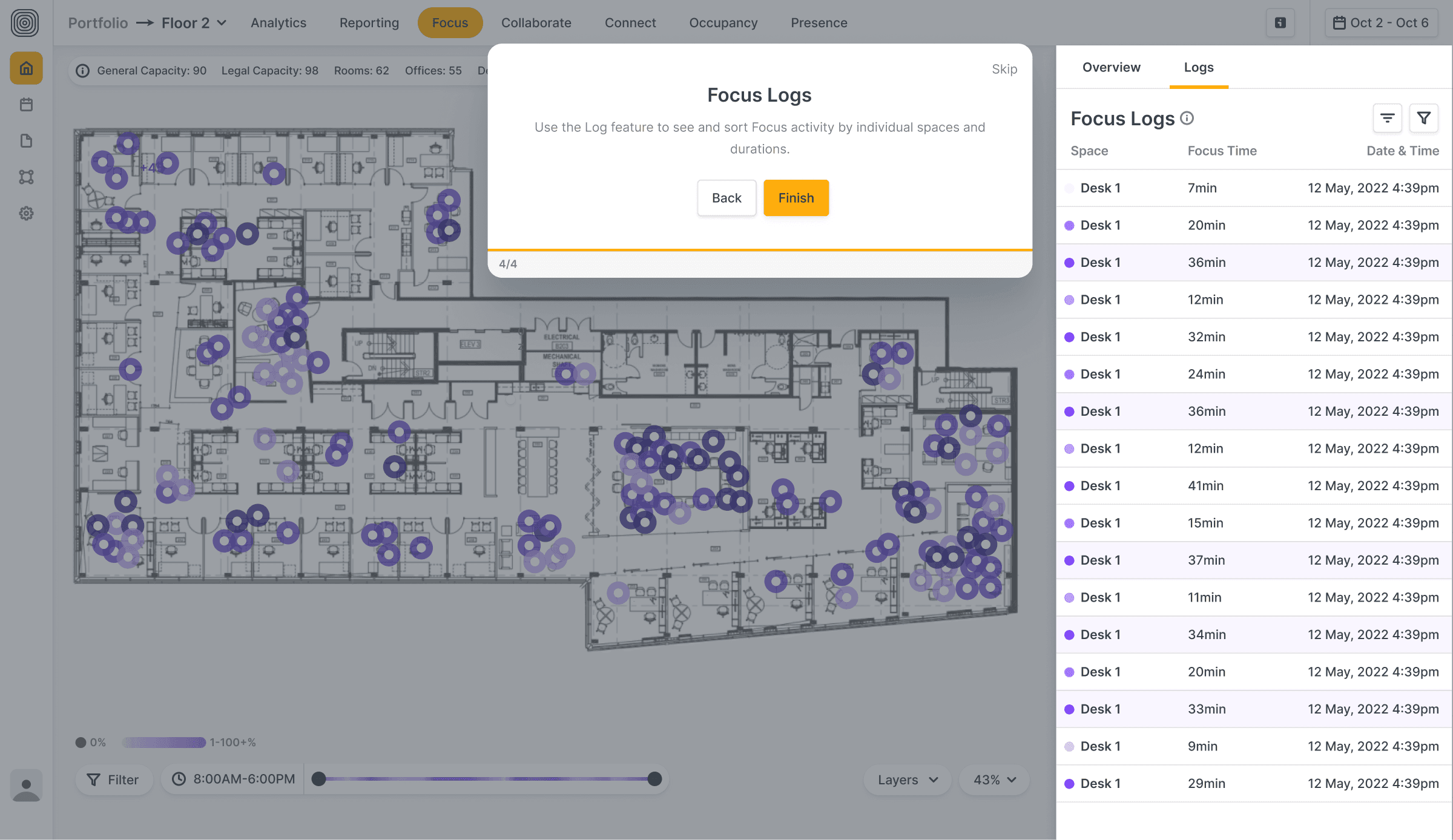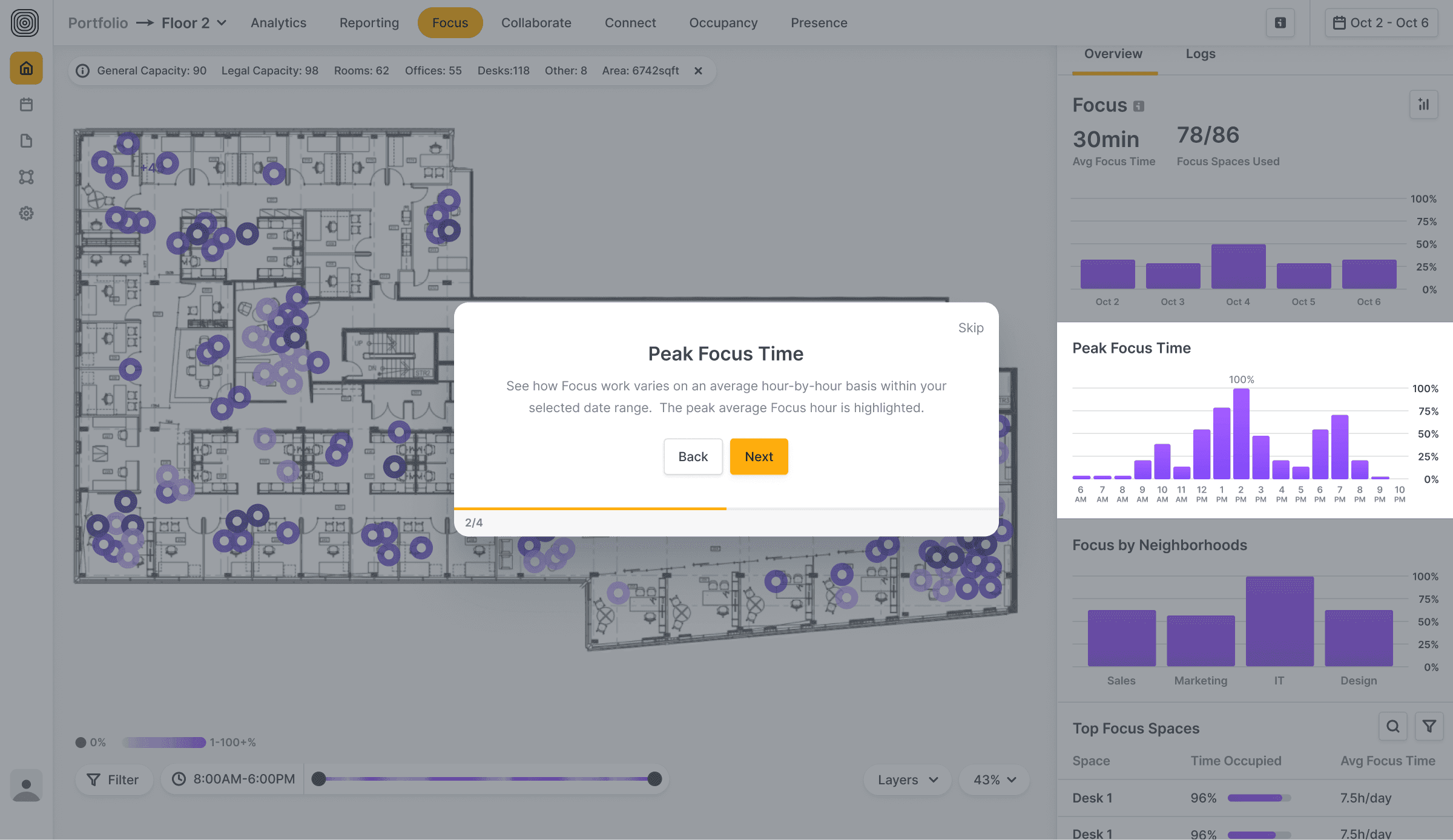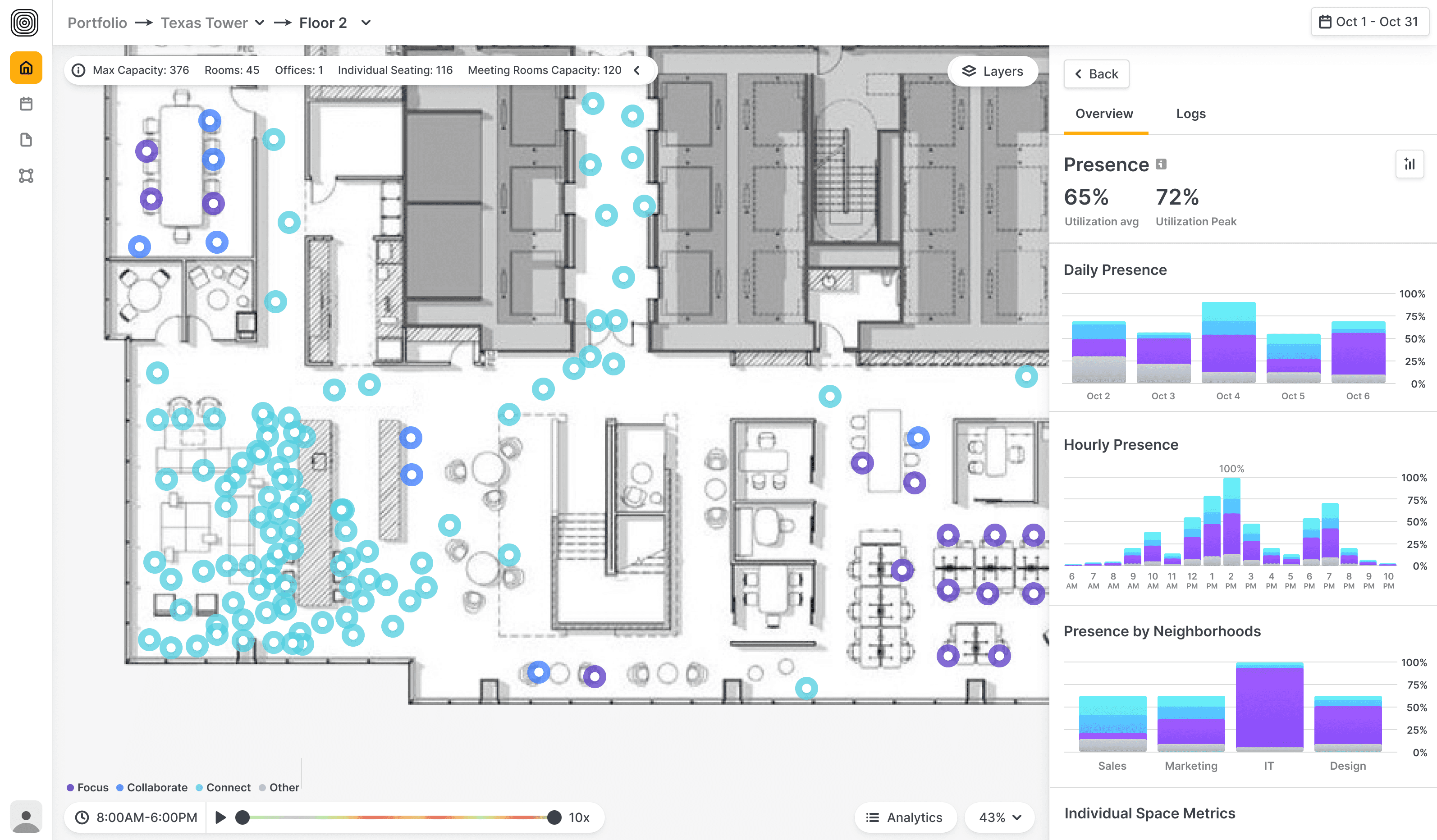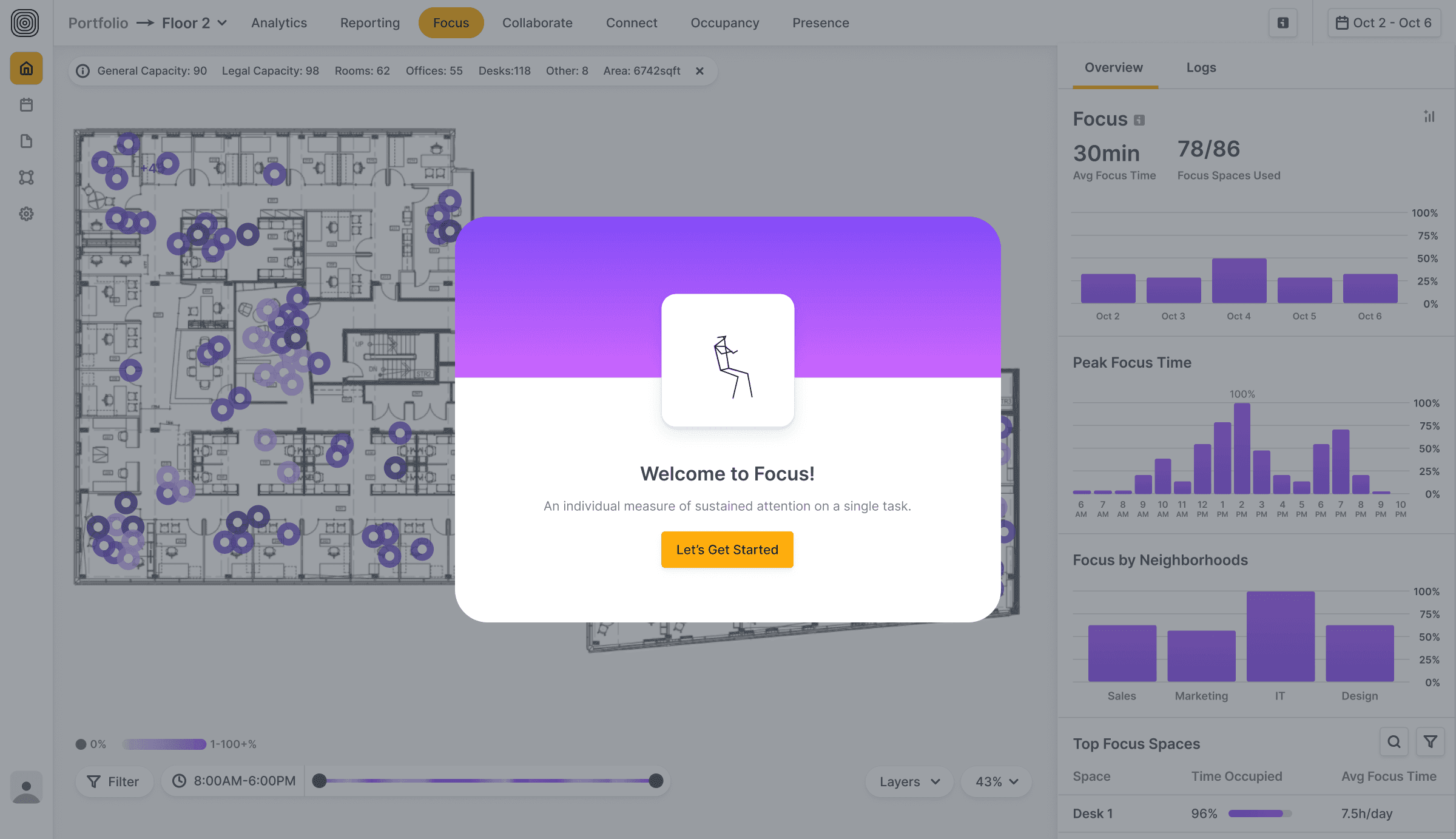 AI-powered software transformed sensor data into human-readable insights. Working with our co-founder and workplace strategist, Pete Bacevice, I helped develop the Focus / Collaborate / Connect / Other model—our core behavioral framework for understanding how space is used: