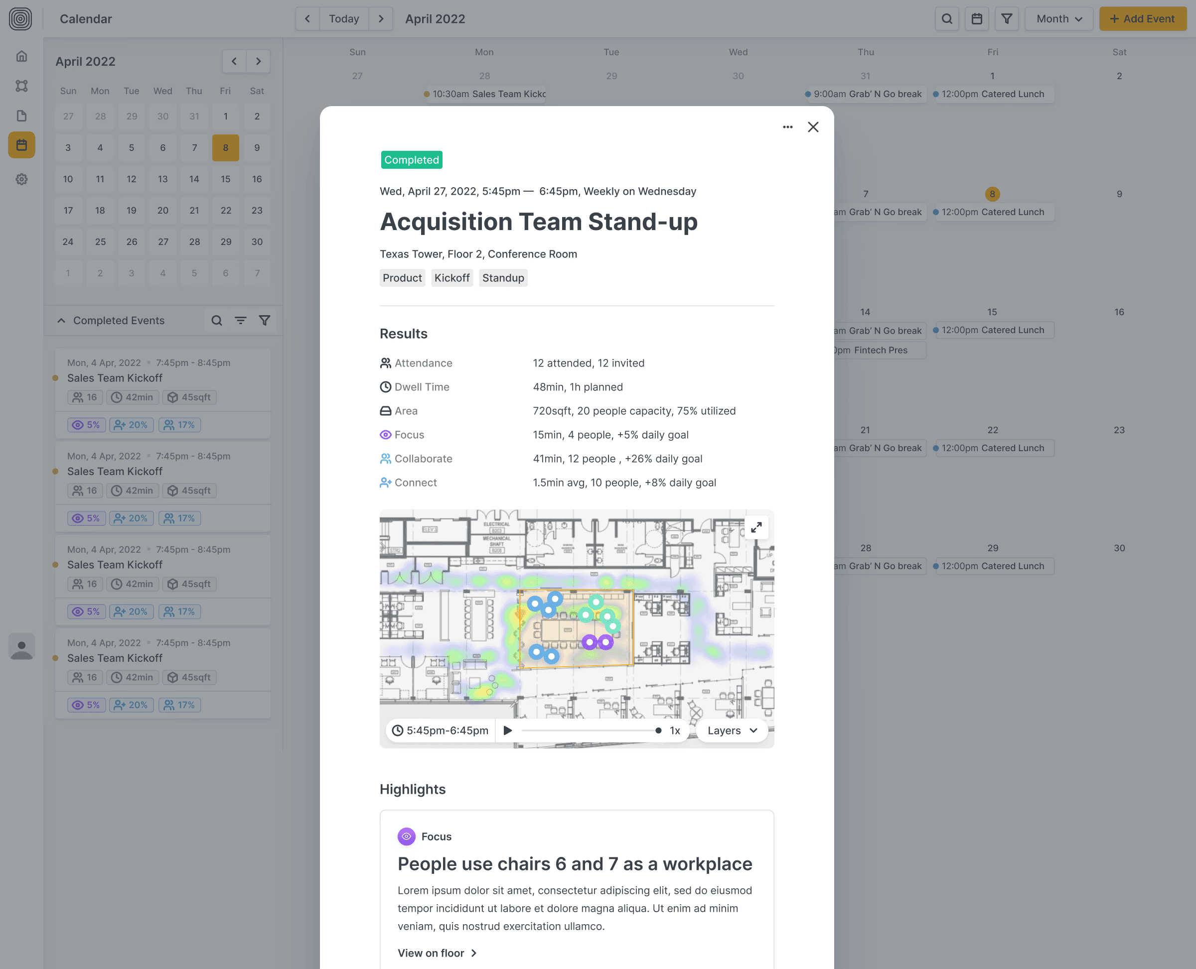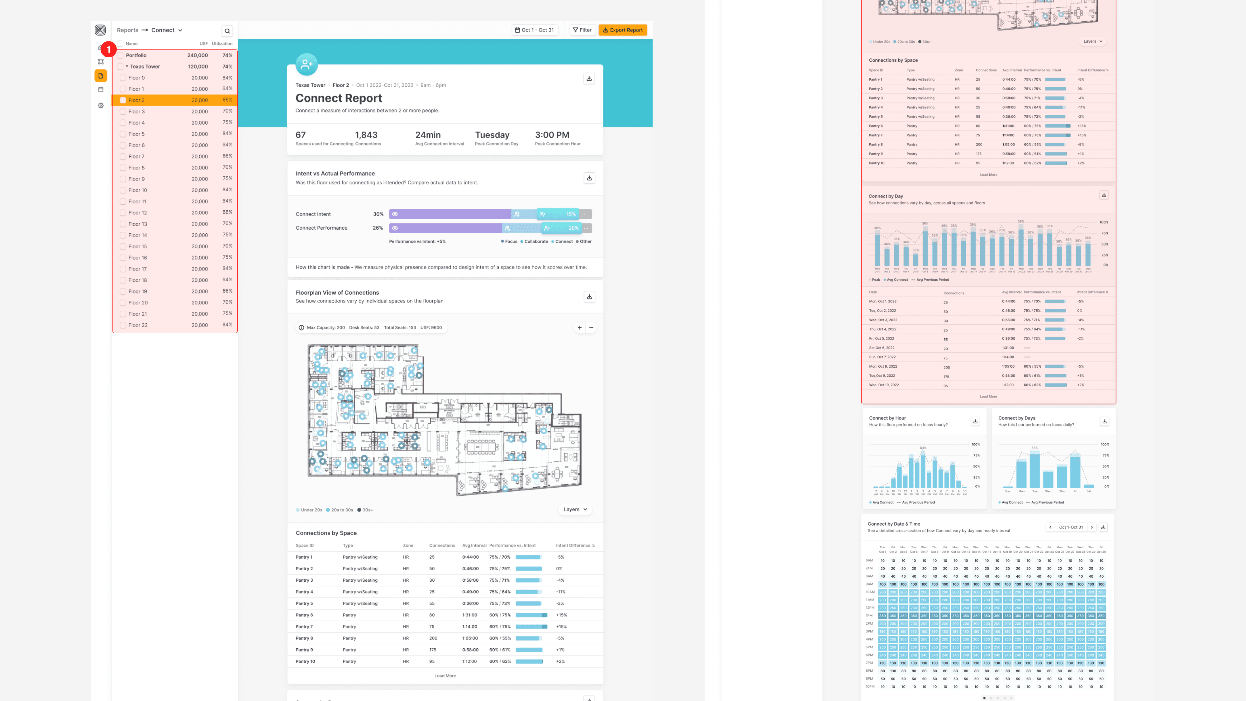 This view helps operations and strategy leads see how each floor is actually being used. We simplified the layout, improved key metrics, and introduced the “intervention” feature to help teams track the impact of small changes with clarity.